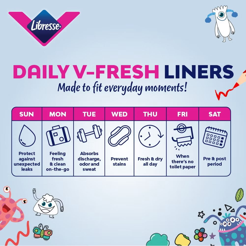 Libresse® Longer & Wider Slim liners are longer in length, offering wider coverage and protection and is ideal for pre and post period or heavy discharge. Comes with a breathable soft cottony surface keeping you dry, everyday.