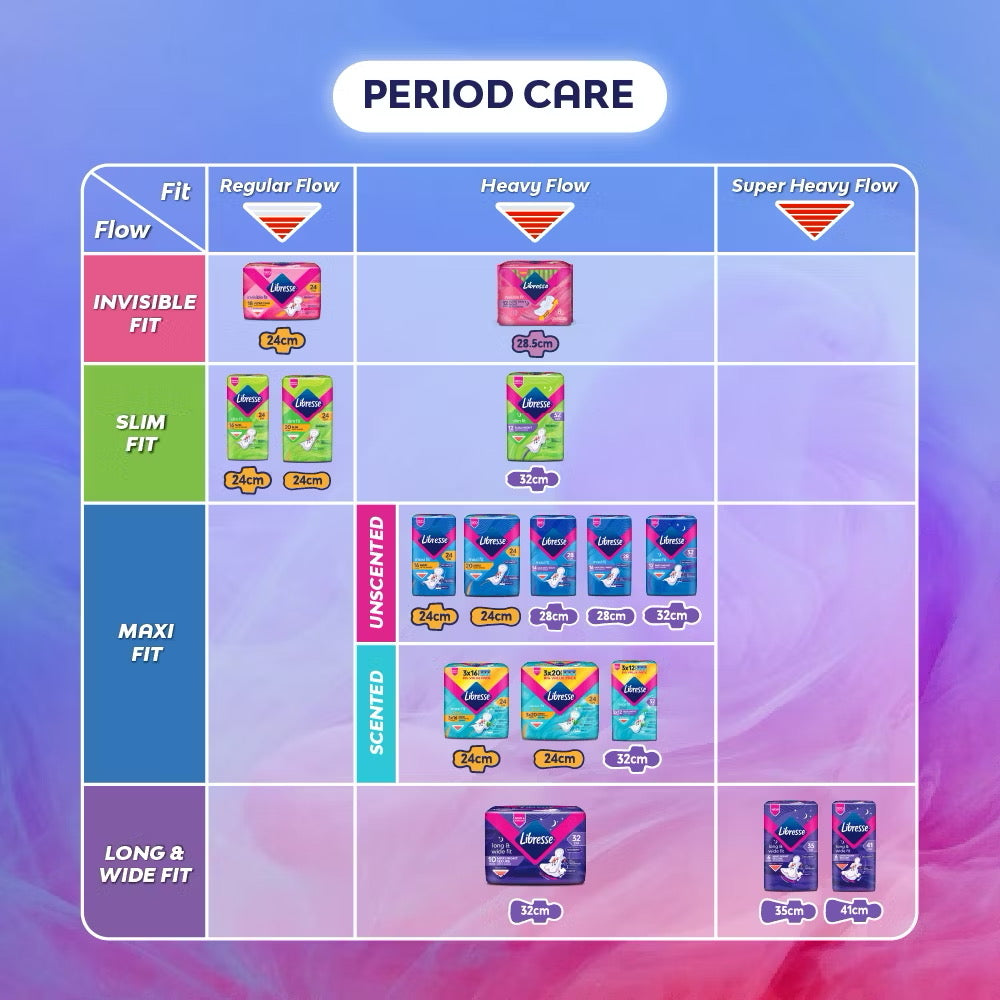 Maxi Night 32cm Wings , suitable for Maxi Fit during heavy flow days. Libresse® pads with SecureFit™ and DFC works together to deliver all round fit and better absorption as it is uniquely designed based on womens' curves to keep your pad securely in place.