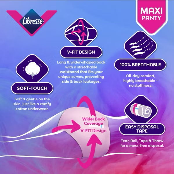 Libresse® Maximum Security Panties (M-L size) is designed for maximum coverage giving you a peace of mind. Body Fit design seamlessly hugs your unique curves to prevent leakage, it also comes with double protection with long and wide absorbent core to prevent side and back leakage plus it is made with soft cottony material and 100% breathable.