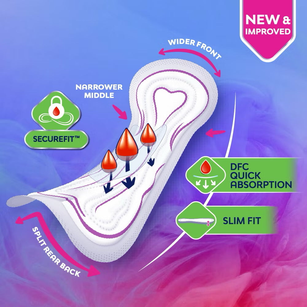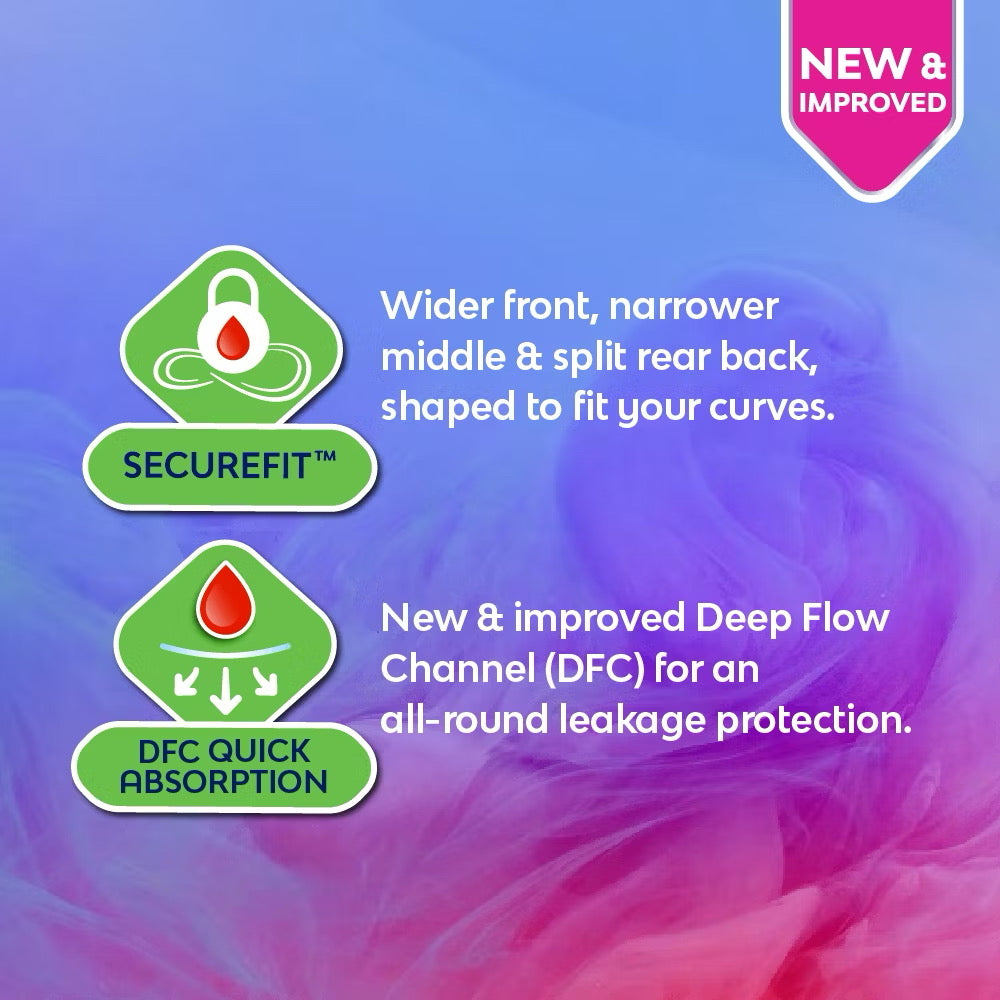 Slim 24cm Non Wings, suitable for Slim Fit during regular flow days. Libresse® pads with SecureFit™ and DFC works together to deliver all round fit and better absorption as it is uniquely designed based on womens' curves to keep your pad securely in place.