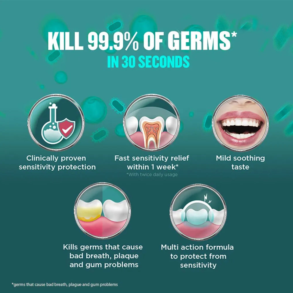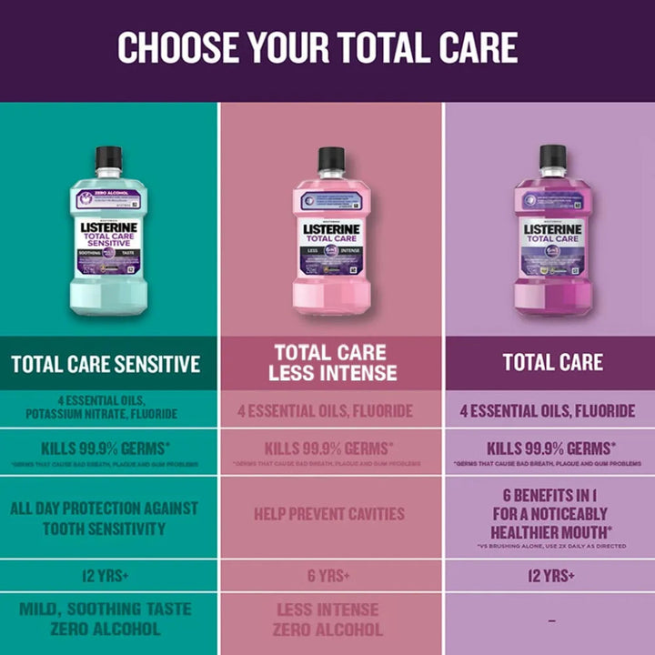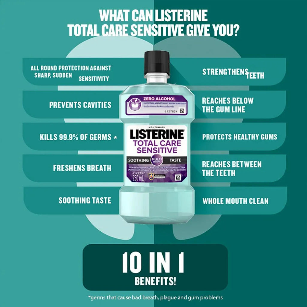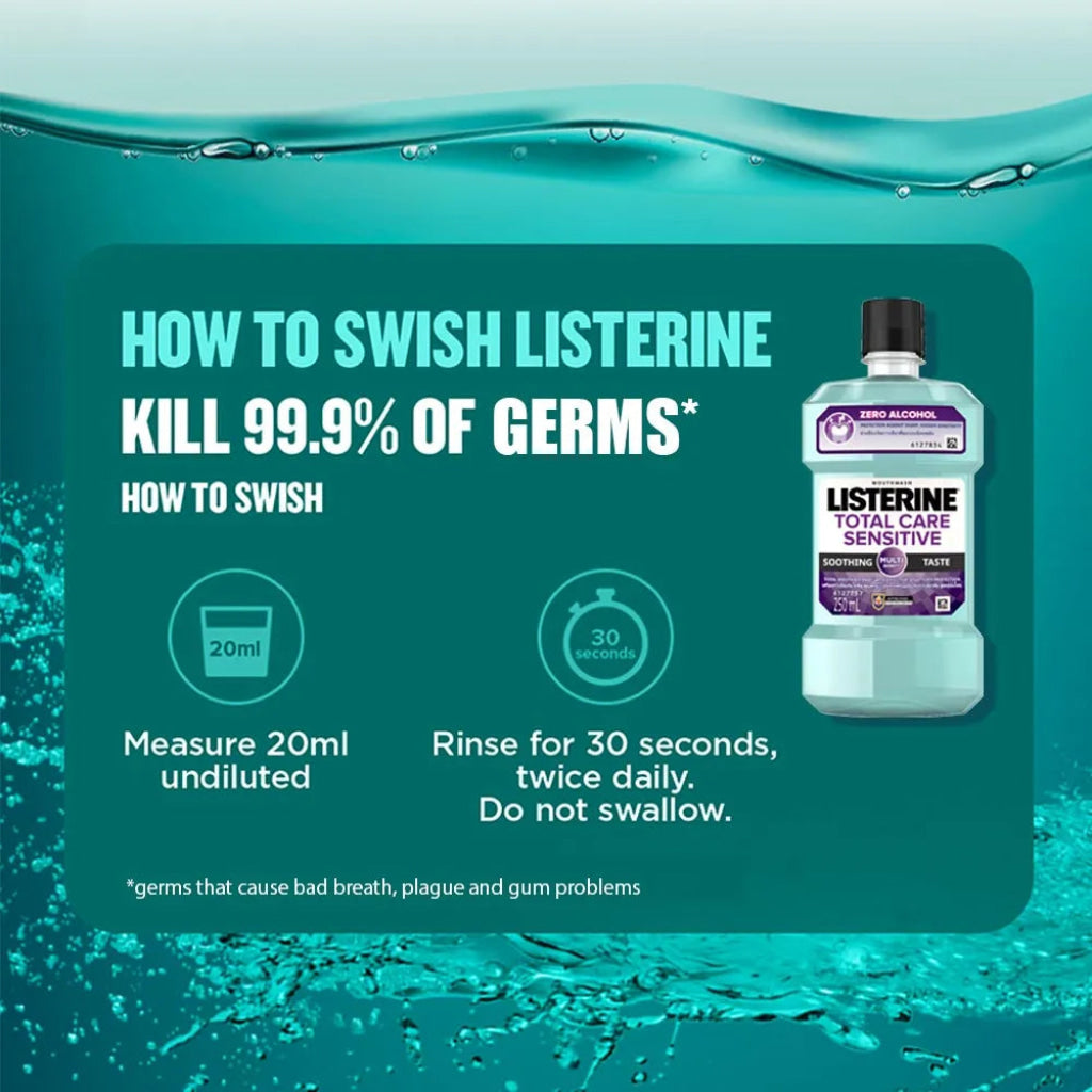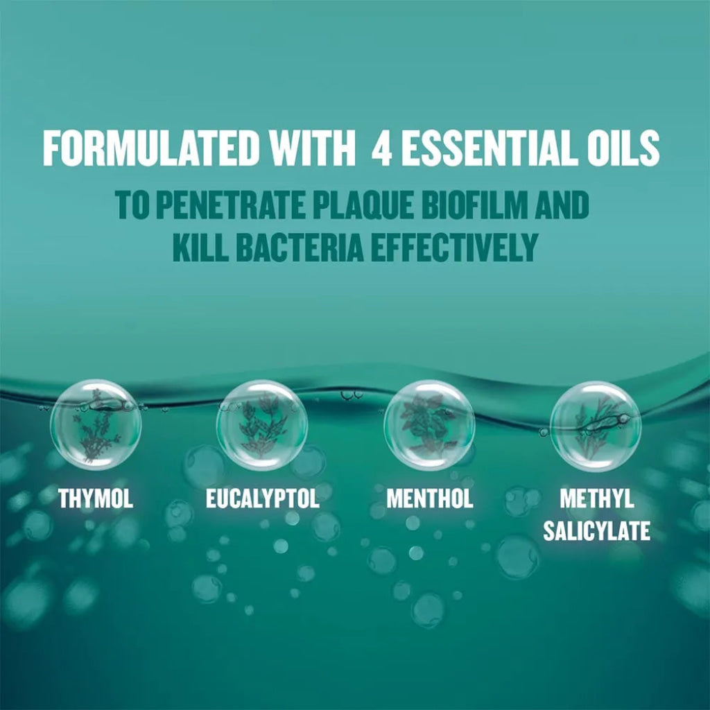 Brushing only cleans 25% of your mouth*, Listerine cleans virtually 100%. Alcohol-free formula with a less intense taste. Enriched with the natural components of green tea, deep cleaning power to kill germs that cause bad breath, plaque and gum problems**. Unique formula of 4 essential oils that deeply penetrates to (fight the germs in the plaque biofilm) kill bacteria *Teeth only made up 25% of mouth.