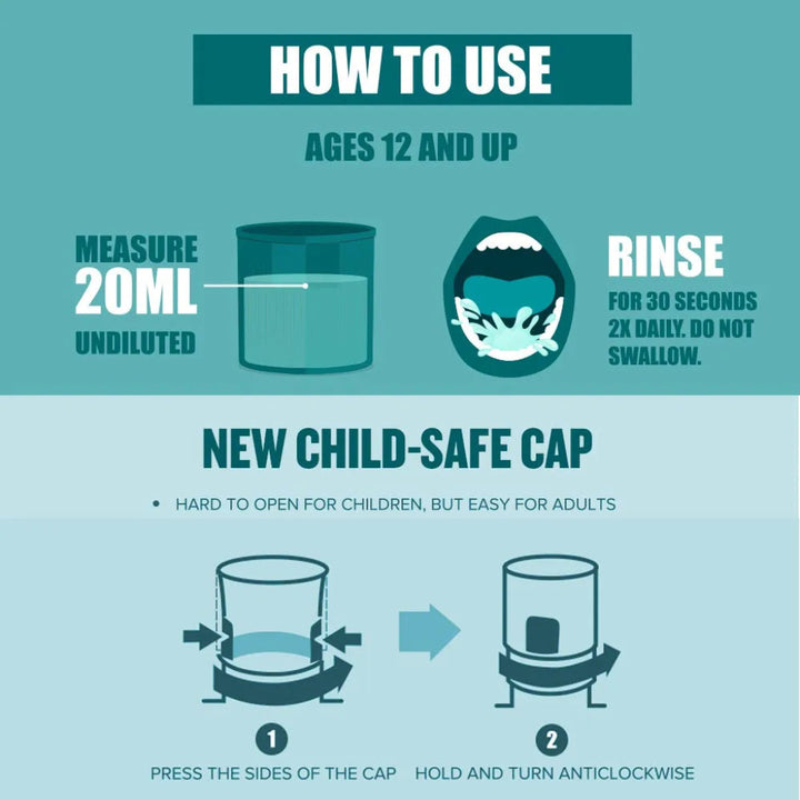 Use (20mL) 10ml full strength for age (above) 6 to 12 and 20ml for adults and age 12+, rinse mouth for 30 seconds, twice daily (for best results) as part of usual oral hygiene.