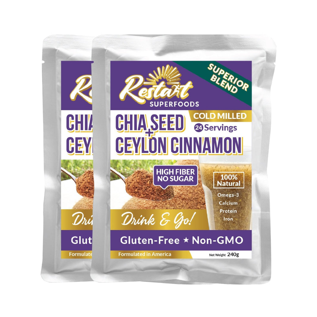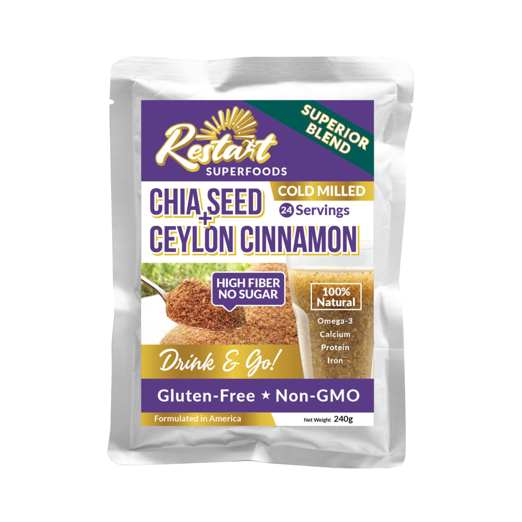 RESTART SUPERIOR BLEND! WORLDS HEALTHIEST SUPERFOOD! ORGANICALLY GROWN CHIA SEEDS… COLD MILLED TO PERFECTION… PLUS ORGANIC CEYLON CINNAMON! … RICH IN VITAMINS AND MINERALS…SUPER HIGH IN OMEGA 3 AND FIBRE! 24 FULL SERVINGS PER BAG! 75 INSTANT RECIPES! TASTES GREAT…ALL DAY ENERGY… JUST 1-2 TABLESPOONS A DAY IS ALL IT TAKES!